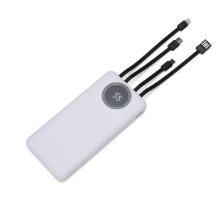 Descrição: Carregador portátil de 10.000mAh com display digital indicador de bateria, contém duas lanternas de led e quatro cabos de saída acoplados, sendo: saída Lightning, saída Tipo-C, saída V8 e saída USB. O carregador possui uma porta USB dupla (entrada e saída) com carga rápida e outras duas portas de entrada: V8 e Tipo-C. Acompanha cabo USB.