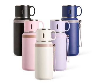 Descrição: Garrafa térmica em inox com pintura eletrostática e capacidade de até 600ml. Possui estrutura de parede dupla e tampa interna rosqueável com anel de vedação, abertura do bocal por botão de acionamento e infusor. Conta ainda com tampa externa em formato de caneca e alça emborrachada para transporte.