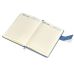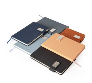 Descrição: Caderneta capa dura em couro sintético com fecho magnético, placa metálica personalizável, além de marca-página em fita de cetim e aproximadamente 96 folhas brancas pautadas.