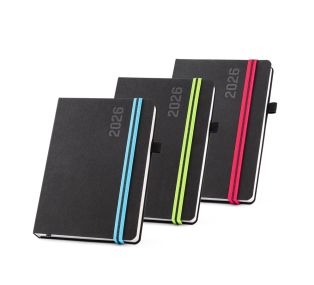Agenda A5 em tecido poliéster. Com suporte para esferográfica (não inclusa) e marcador em fita. Está organizada num plano diário (70 g/m²). 145 x 212 mm