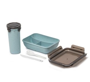 Descrição: Kit com copo salada de 500ml e marmita hermética de 1L com divisórias, garfo e faca feitos em fibra de bambu. A combinação ideal para as refeições do dia a dia. Feitos em PP atóxico e livres de BPA, são totalmente seguros para alimentos. Ambos são equipados com travas de segurança e supervedação, permitindo que leve-os para qualquer lugar sem riscos de vazamentos. O copo possui escala de medição até 500 ml e sua tampa ainda serve como porta copo, enquanto a marmita contém três divisórias internas que mantêm os sabores separados e controlam as porções, facilitando a montagem de uma dieta equilibrada.