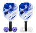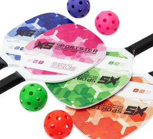 Descrição: Kit Pickleball com duas raquetes de madeira (sendo uma face personalizada e outra lisa) com grip composto em fibras de carbono e vidro e quatro bolas plástica com 26 furos. Acompanha bolsa de nylon com alça de mão e visor plástico transparente.