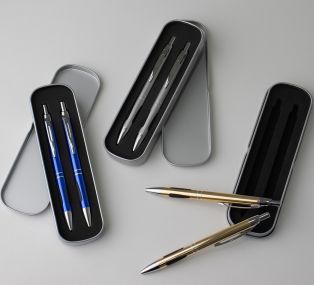 Descrição: Conjunto de caneta e lapiseira metálicas em estojo de metal. Caneta e lapiseira possuem acabamento fosco, detalhe emborrachado na parte inferior, carga esferográfica azul de 1.0mm e acionamento por clique. Estojo revestido em espuma.