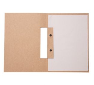 Pasta convenção em kraft de frente e verso liso, lado esquerdo com dois parafusos plásticos rosqueáveis na cor preta. Abertura lateral, acompanha 25 folhas ecológicas de tamanho A4.