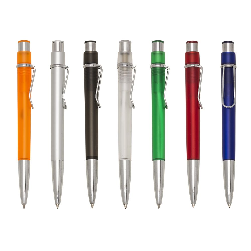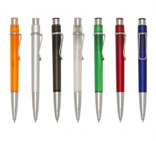 Caneta plástica inteira colorida com detalhes em prata. Clip de metal, possui anel colorido no acionador. Aciona por clique.