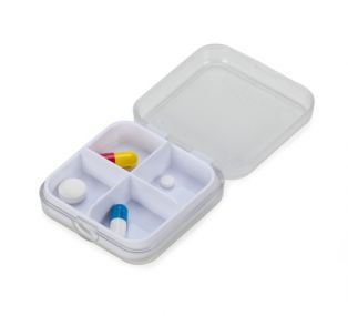 Porta comprimido de acrílico fosco, possui "bandeja" de quatro divisórias para comprimidos.
