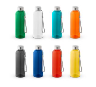 Squeeze em PET 100% reciclado e tampa em aço inox, com pega em corda para facilitar o transporte. Capacidade até 580 mL.